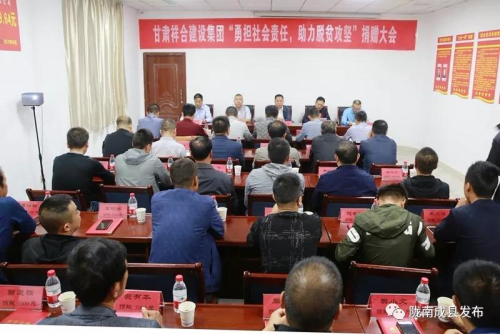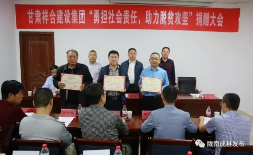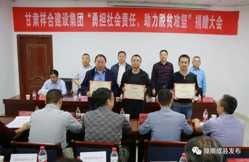9月11日,甘肅祥合集團公司召開"勇擔社會責任、助力脫貧攻堅"捐贈大會。本次新捐贈幫扶資金24萬元,主要用于宋坪鄉、城關鎮、紙坊鎮、拋沙鎮、沙壩鎮的貧困村幫扶及37戶特殊困難群眾。