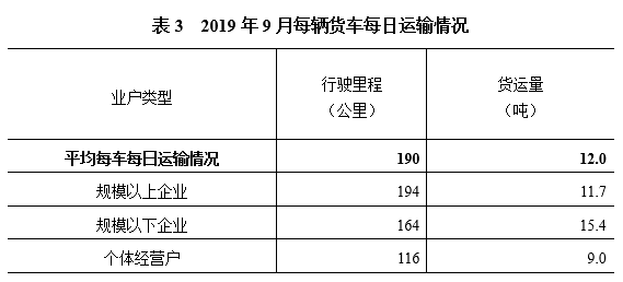 2019年9月每輛貨車每日平均行駛190公里,運(yùn)輸貨物12.0噸。每噸貨物運(yùn)輸距離平均為177公里。