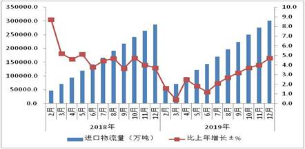 全球產(chǎn)業(yè)鏈地位繼續(xù)鞏固,進(jìn)口物流量質(zhì)齊升。2019年我國貨物貿(mào)易規(guī)模邁上新臺階,全年貨物進(jìn)出口總額31.5萬億元,增長3.4%,出口占國際市場份額穩(wěn)步提升,根據(jù)世界貿(mào)易組織統(tǒng)計,2019年前三季度我國出口增速比全球高2.8個百分點,國際市場份額比2018年提高0.3個百分點至13.1%。在此背景下,我國全球產(chǎn)業(yè)鏈的地位繼續(xù)鞏固,進(jìn)口物流需求形勢總體良好,逐季回升,特別是12月進(jìn)口總值更是創(chuàng)下月度歷史峰值。海關(guān)數(shù)據(jù)顯示,部分原材料和能源產(chǎn)品進(jìn)口持續(xù)增加。2019年,我國進(jìn)口鐵礦砂10.7億噸,增長0.5%;進(jìn)口原油5.06億噸,增長9.5%;進(jìn)口天然氣9656萬噸,增長6.9%;進(jìn)口大豆8851萬噸,增長0.5%。此外,消費品、醫(yī)藥品進(jìn)口分別增長19%和25.8%。